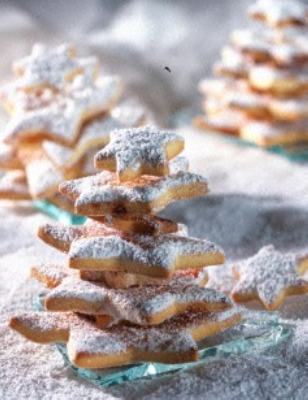 Sterne à 4,5 cm Ø ausstechen. Auf zwei mit Backpapier ausgelegte Bleche legen.