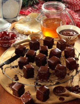 heißen Wasserbad schmelzen. Abkühlen lassen. Lebkuchenplatte in ca. 3x3 cm große
